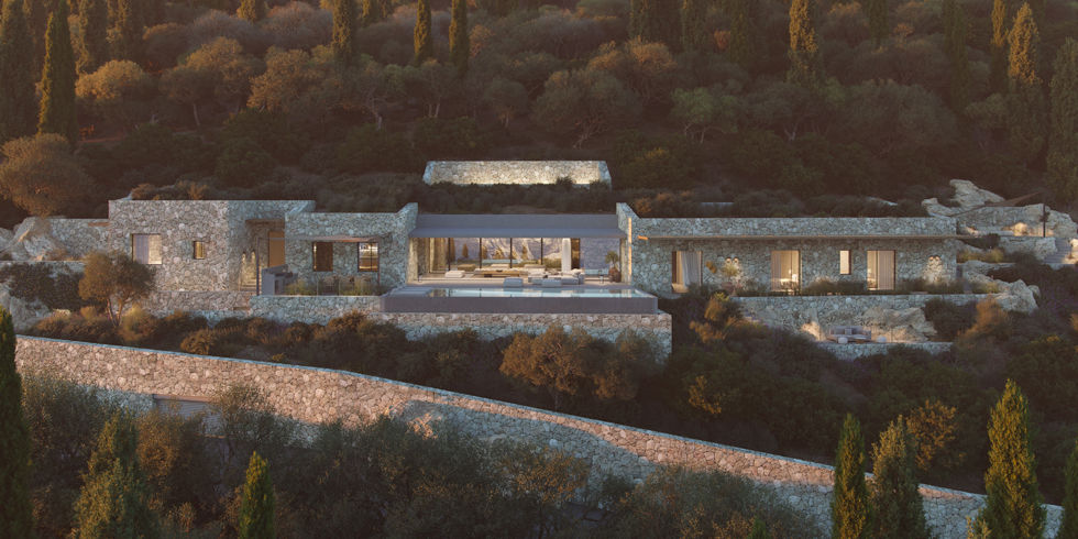 The beloved is Lamato. The Italian link of Corfu and the magnificent spot of this residence create feelings and strong bonds. Having to carve an inclined rocky hillside with a strong presence and in between the trees, place a residence that feels embraced, feels beloved. This practically one level residence in an overall compact area needed to take use the most of this uninviting yet uniquely beautiful plot just a breath away from the seawater. Being linear allows to fully expand along the plot and provide stunning views. The approach is clear, neat and with the large top to bottom glass frames the residence allows to be embraced by the surroundings. The cozy dining area reflects back to the past and while it is contradictory with the minimalistic living room, the chemistry is smooth. Undoubtedly, Lamato is the bella vita and a residence that pampers without spoiling its guests and its surroundings.